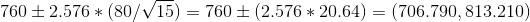 A random sample of 15 items is drawn from a population whose standard deviation is unknown. The sample mean is x⎯⎯x¯ = 760 and the sample standard deviation is s = 20. Use Appendix D to find the values of Student’s t. |