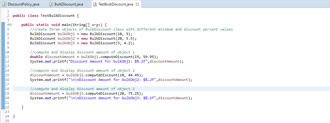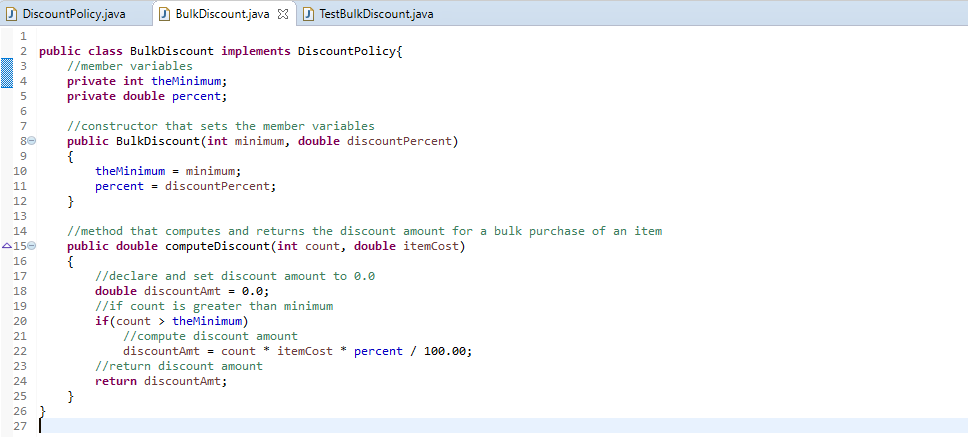 Create an Interface DiscountPolicy. It should have a single abstract method computeDiscount that will return the discount for the purchase of a given number of a single item. The method has two parameters, count (int type) and itemCost (double type). Create a class BulkDiscount that implements Interface DiscountPolicy. The BulkDiscount class has two proprieties: theMinimum (int type), and percent (double type). It should have a constructor that sets the parameters, minimum and percent to a given values. It should define the method computeDiscount so that if the quantity (count) purchased of an item is more than minimum, the discount is calculated as count*itemCost*percentOff/100.0, otherwise, discount will be equal=0.0; Write a test program that tests your method. Create at least three objects of BulkDiscount class and print out their discount values. (JAVA)