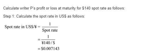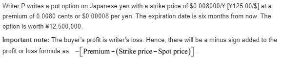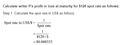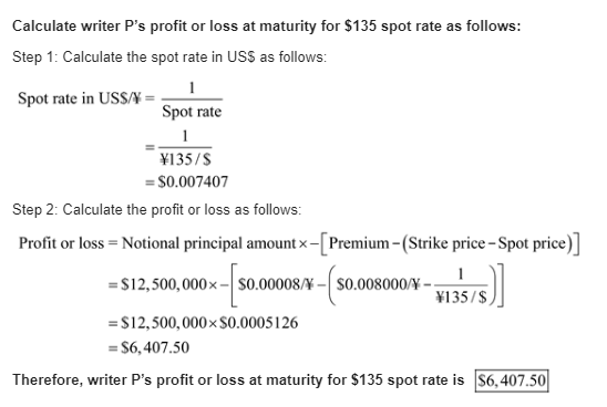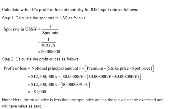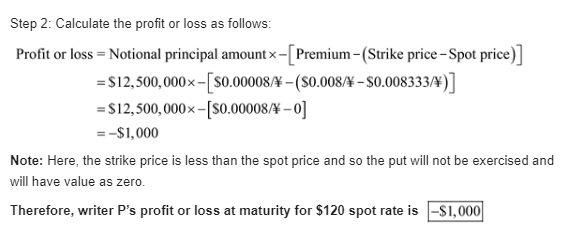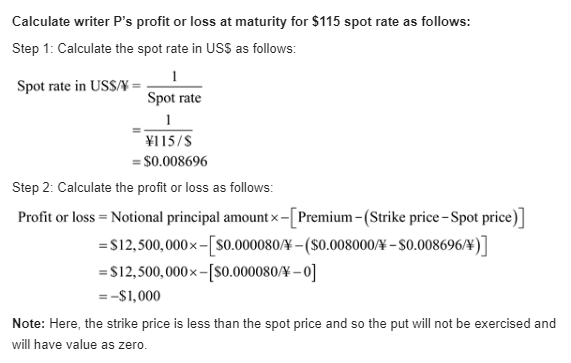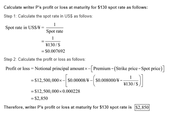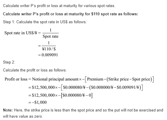 Kiko Peleh's Puts. Kiko Peleh writes a put option on Japanese yen with a strike price of $ 0.008000 divided by yen (yen 125.00 divided by $) at a premium of 0.0080 cents per yen and with an expiration date six month from now. The option is for ¥12,500,000. What is Kiko's profit or loss at maturity if the ending spot rates are yen 110 divided by $, yen 115 divided by $, yen 120 divided by $, yen 125 divided by $, yen 130 divided by $, yen 135 divided by $, and yen 140 divided by $.