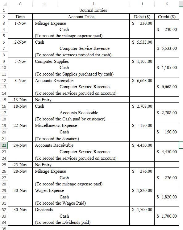 | Nov. | 1 | The company reimbursed S. Rey in cash for business automobile mileage allowance (Rey logged 1,000 miles at $0.23 per mile). | ||