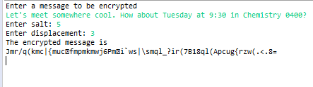 This is a java assignment inspired by Caesar algorithm with some minor modifications. You are required to take in three inputs; a string, which is the message that you want to encrypt, an integer number that we call it salt, which is going to salt your plain message to help create a better encrypted message and an int to be used for displacement of the letters.