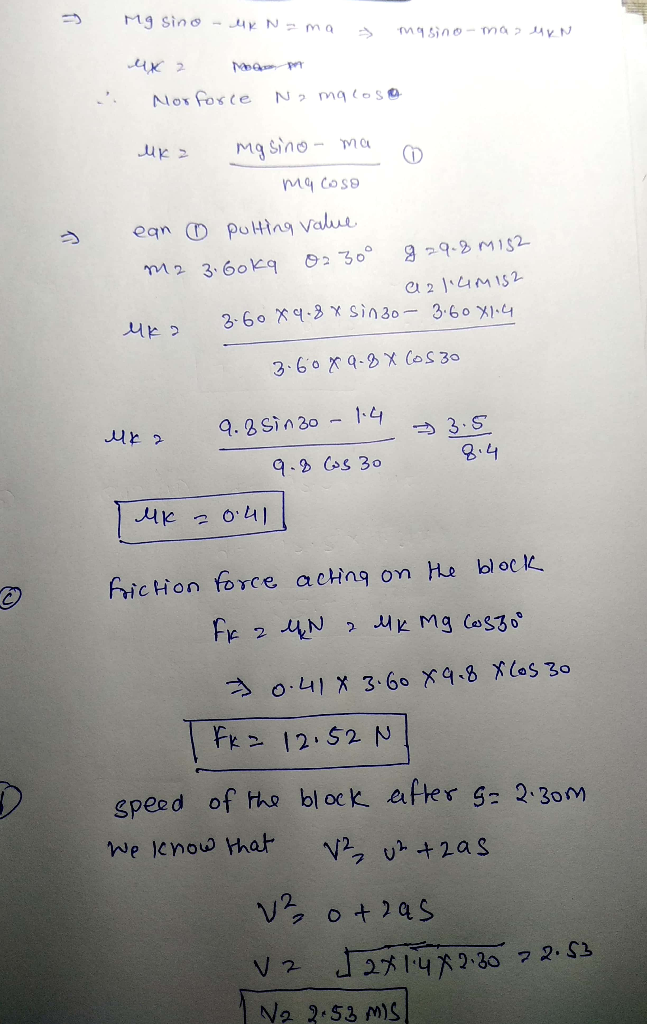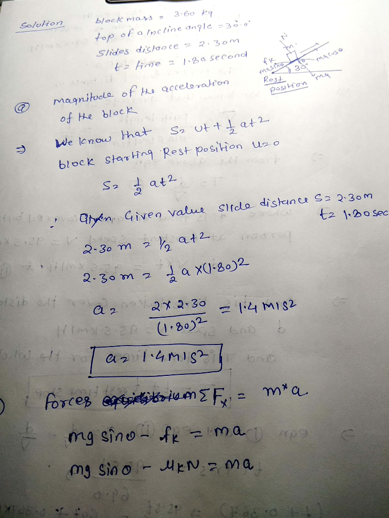 A 3.60-kg block starts from rest at the top of a 30.0° incline and slides a distance of 2.30 m down the incline in 1.80 s.