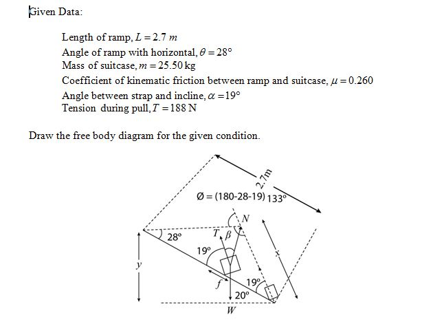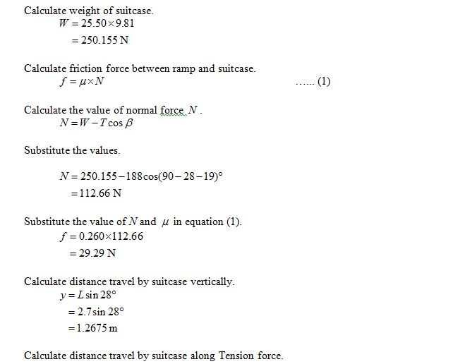 A student, while moving out of his old apartment, is loading a rented moving truck using a ramp which is at a rather steep angle of 28.0 degrees above the horizontal; the ramp is 2.70 m long. At one point in the loading process he drags a loaded suitcase of mass 25.50 kg up the full length of the ramp. The wheels on the old suitcase have long since ceased to function properly, so that the effective coefficient of kinetic friction between the suitcase and the inclined ramp is 0.260. The old suitcase has a strap attached to one corner, and the student does the dragging by pulling on this strap and running up the ramp (he is in a hurry) so that he and the suitcase speed up while going up the ramp. It turns out the the student is able to maintain a tension of 188.0 N during his pull, and the angle between the strap and the incline is 19.0 degrees(the strap direction is 19.0 degrees higher than the incline angle).