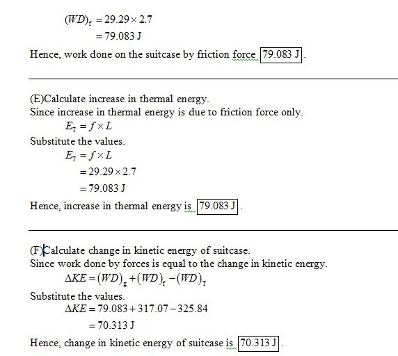 E.As a result of the pull up the incline, what is the increase in the thermal energy present in the suitcase and in the surface of the ramp?