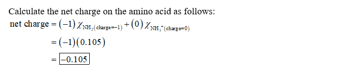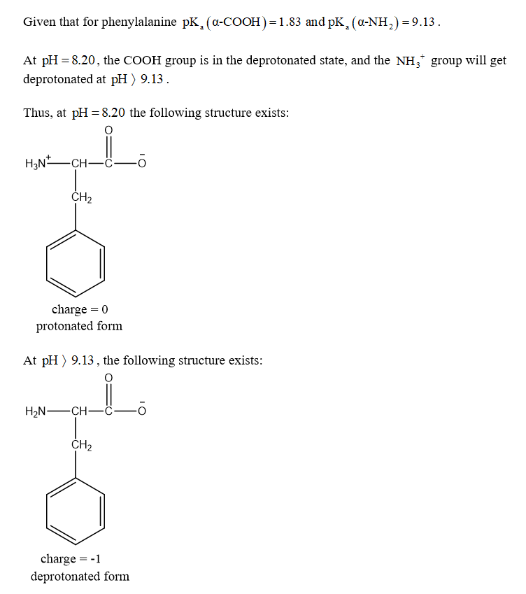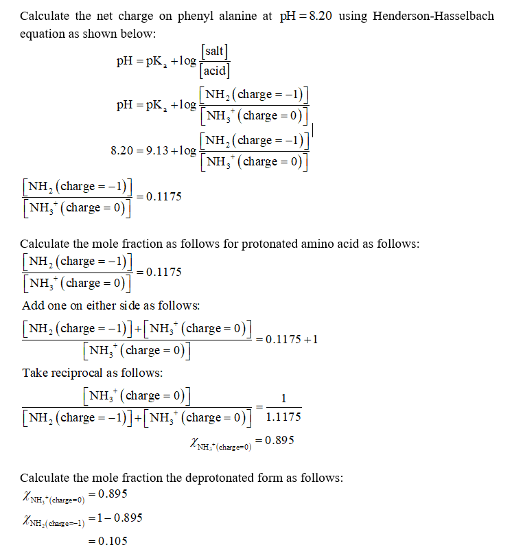 The pKa of the α-carboxyl group of phenylalanine is 1.83, and the pKa of its α-amino group is is 9.13. Calculate the average net charge on phenylalanine if it is in a solution that has a pH of 8.20 (If the charge is positive, you do not need to enter a \" \" sign.)