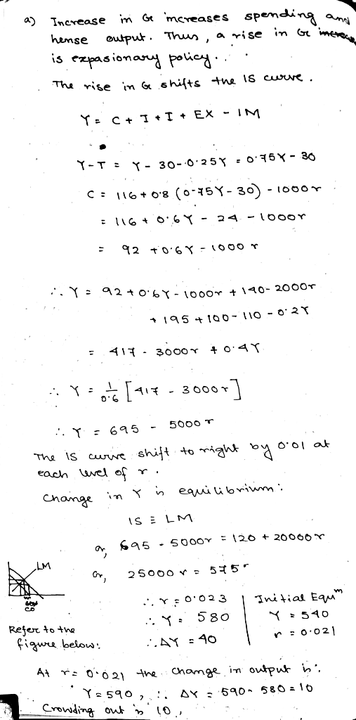 a) If G increases by 30, is it an expansionary, or a contractionary (pick one) fiscal policy? By how much does the IS and LM curves shift and by how much does Y change?