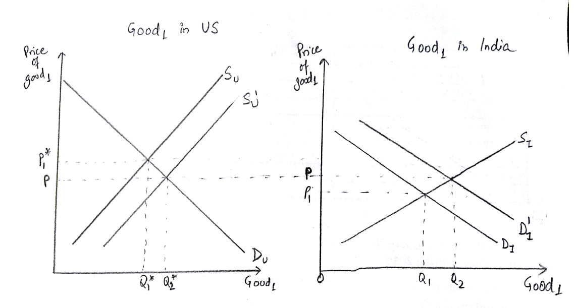 In the diagram below, the equilibrium of demand and supply gives the price P1* in US and P1 in India for the same commodity Good1. P1 < P1* . This reduced price in India increases the demand for the product in India raising its prices in the country. At the same time, the trader will sell the product at higher prices in US, brought from India at lower prices, thereby registering profits. This increases the supply in US and lowering prices in the country. This process will happen until the price in both the countries equals at P.