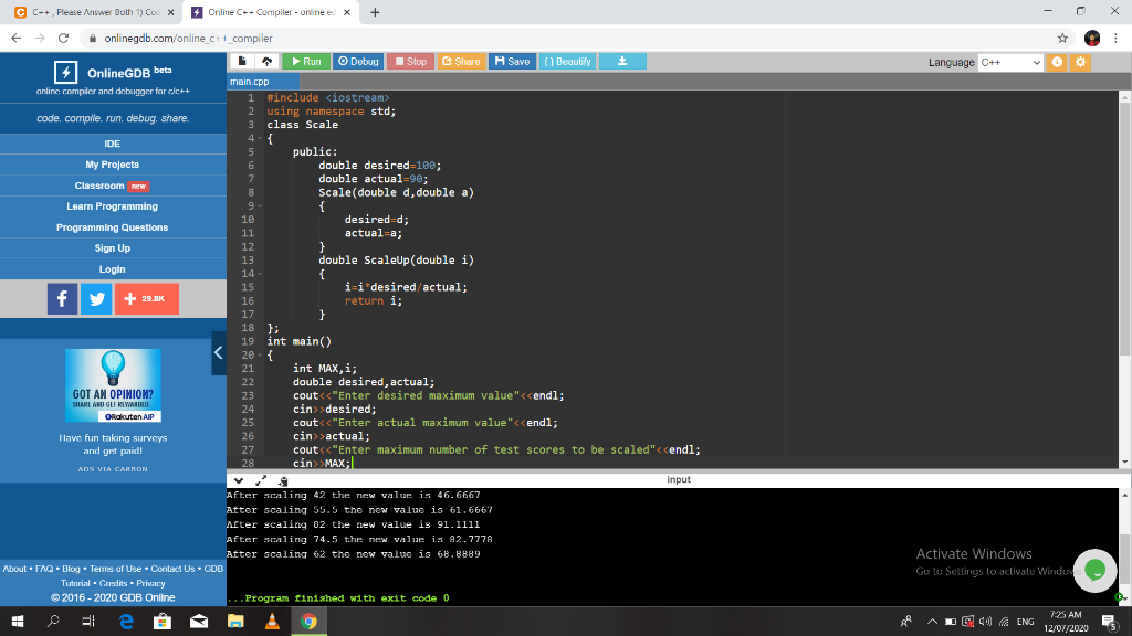 1) Code a function object class which can scale data toward a desired maximum given the actual maximum and the desired maximum. (Reminder: to scale a value v use v*desired/actual.)