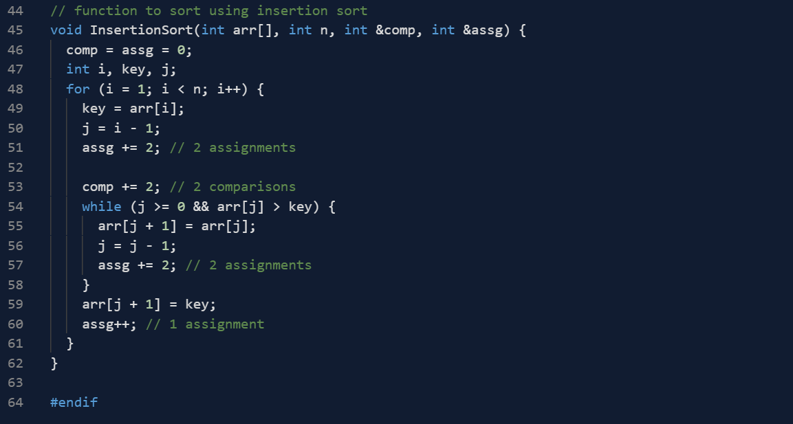 void InsertionSort(int arr[], int n, int &comp, int &assg) {