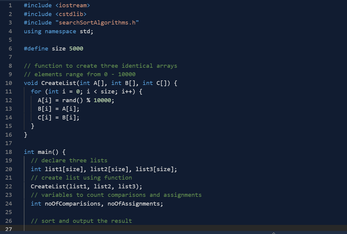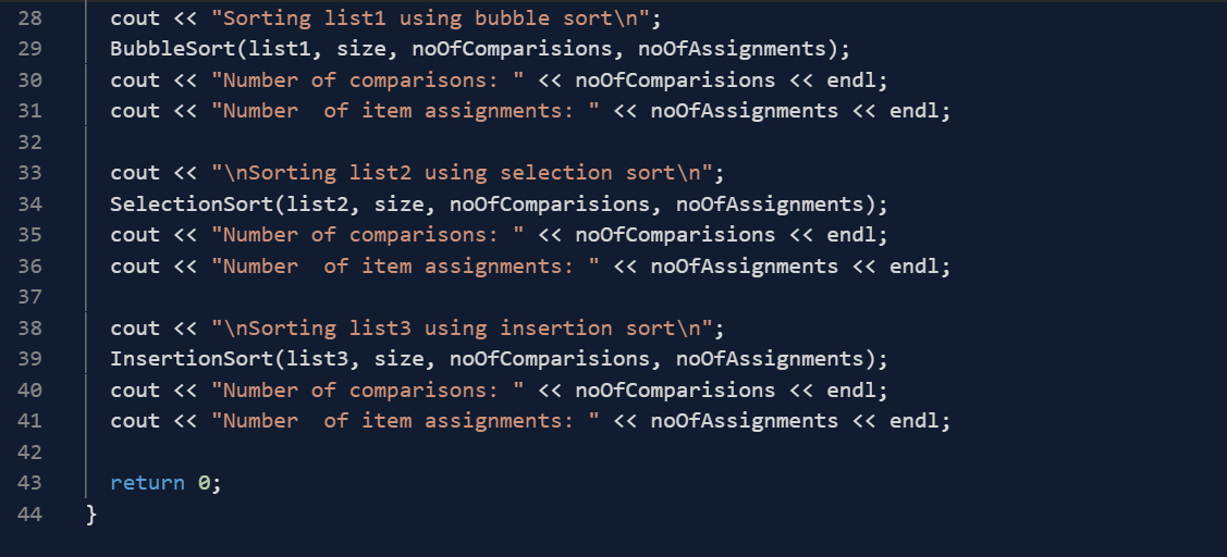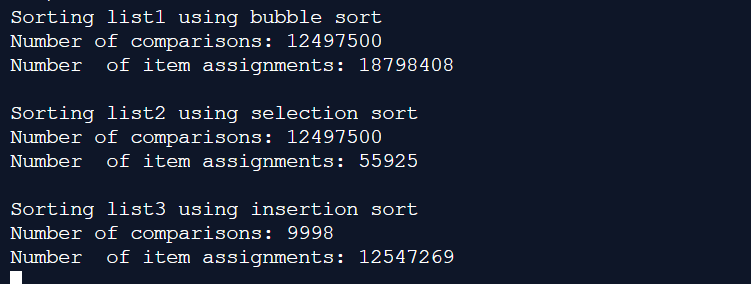 InsertionSort(list3, size, noOfComparisions, noOfAssignments);