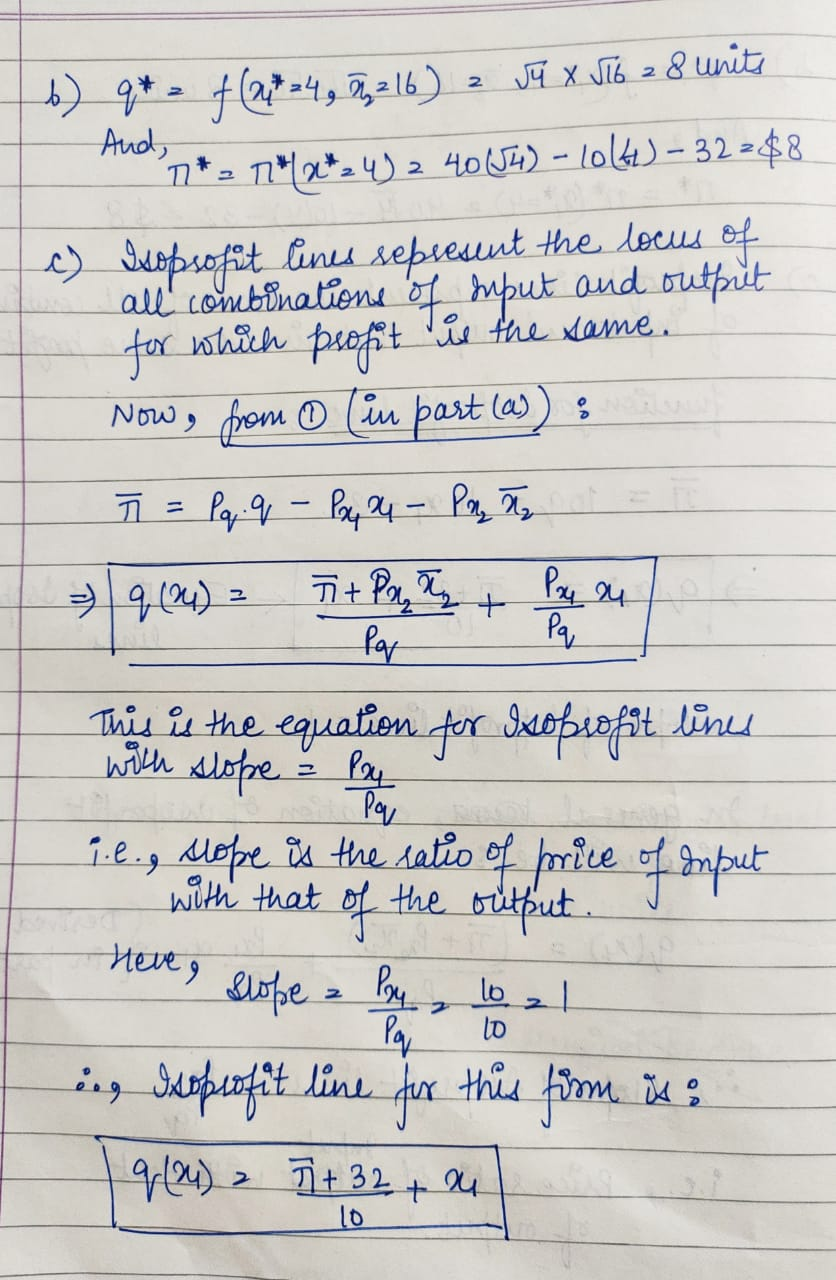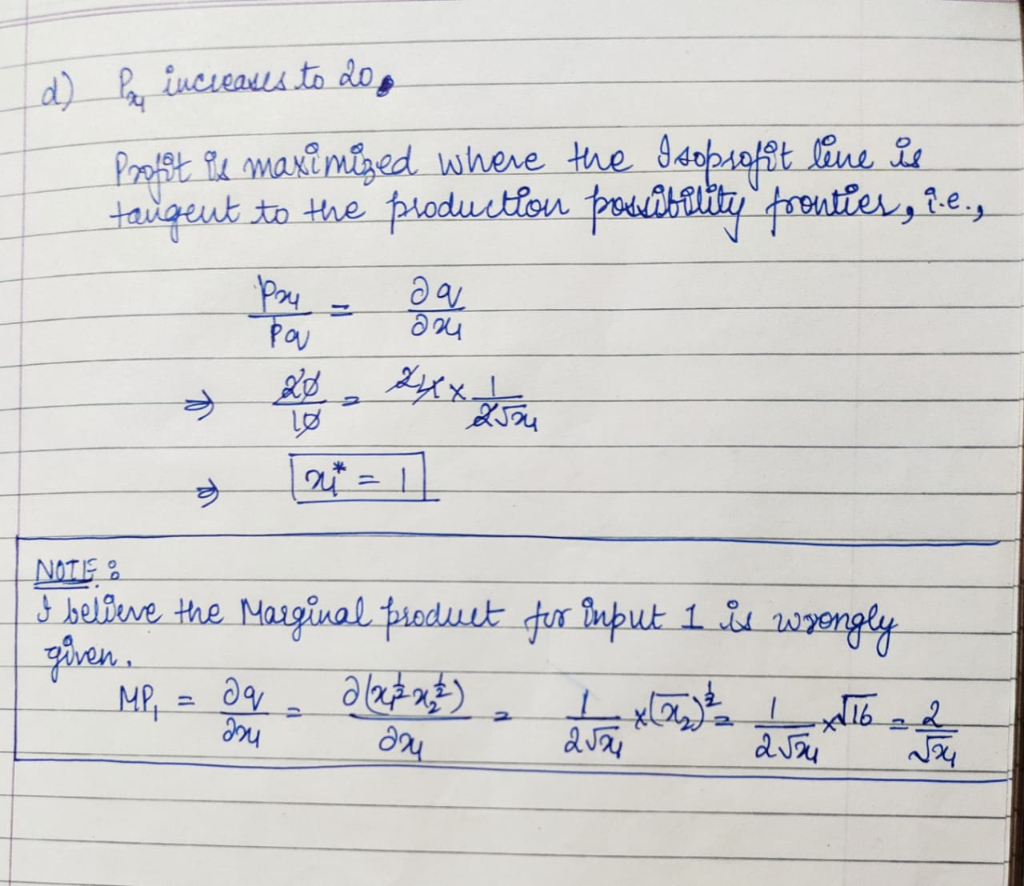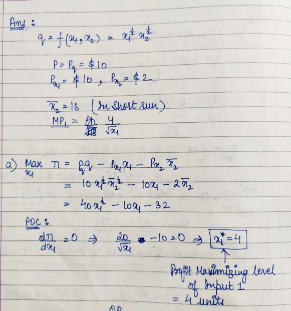 This firm purchases inputs and sells output in competitive markets. The price of output is $10 per unit and the prices of the inputs x1 and x2 are $10 and $2 respectively. In the short run x2 is fixed and equal to 16. The marginal product for input 1 is: MP1=4/(x_1^(1/2) )