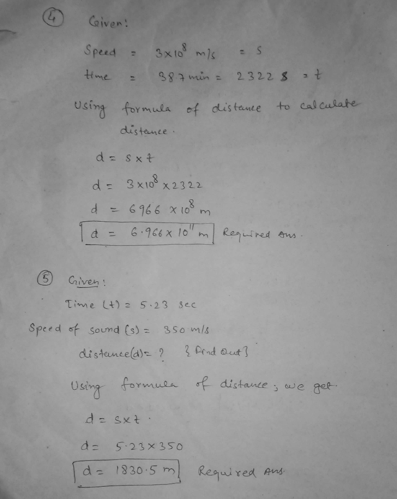 5. How far away was a lightning strike if thunder is heard 5.23 seconds after seeing the flash? Assume that sound traveled at 350.0 m/s during the storm.