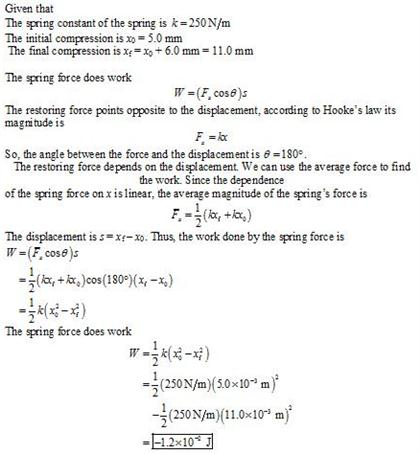 A pen contains a spring with a spring constant of 250 N/m. When the tip of the pen is in its retracted position, the spring is compressed 5.0 mm from its unstrained length. In order to push the tip out and lock it into its writing position,the spring must be compressed an ad- ditional 6.0 mm. How much work is done by the spring force to ready the pen for writing? Be sure to include the proper algebraic sign with your answer.