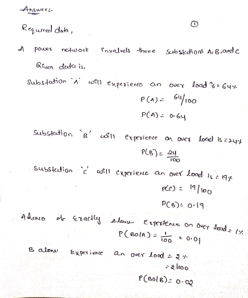 A power network involves three substations A, B, and C. Overloads at any of these substations might result in a blackout of the entire network. Past history has shown that if substation A alone experiences an overload, then there is a 1% chance of a network blackout. For stations B and C alone these percentages are 2% and 3%, respectively. Overloads at two or more substations simultaneously result in a blackout 5% of the time. During a heat wave there is a 64% chance that substation A will experience an overload, a 24% chance that substation B will experience an overload, and a 19% chance that substation C will experience an overload. There is a 3% chance that exactly two of the substations will simultaneously experience overload, and it is equally likely to be any two of the three. Finally, there is a 2% chance that all three substations experience an overload.