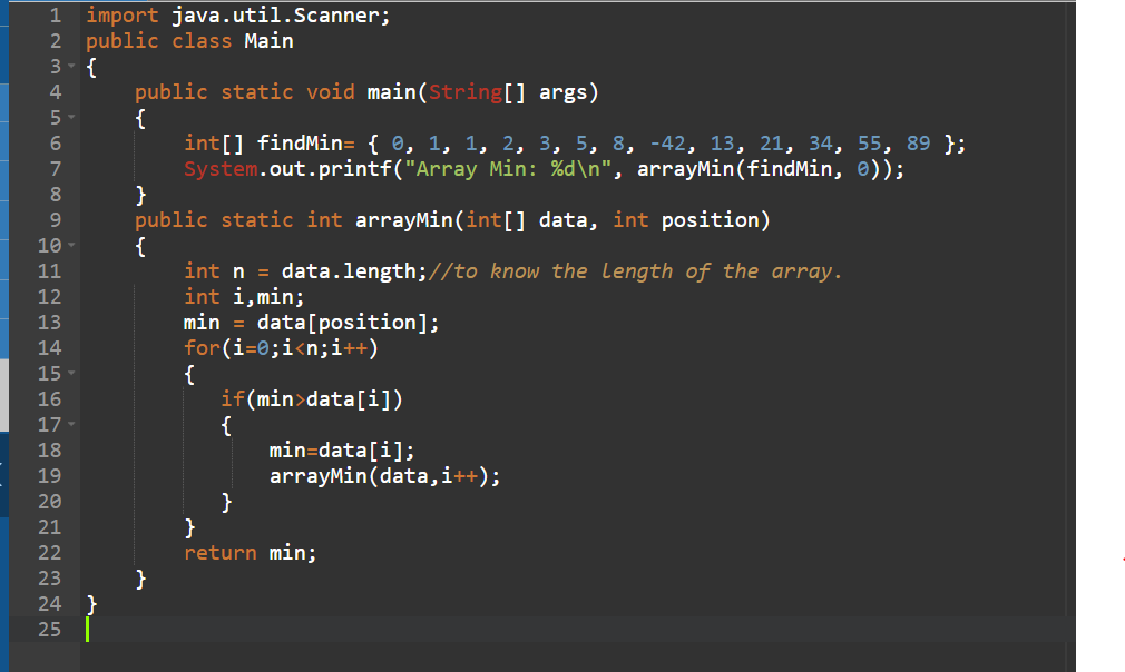System.out.printf("Array Min: %d\n", arrayMin(findMin, 0)