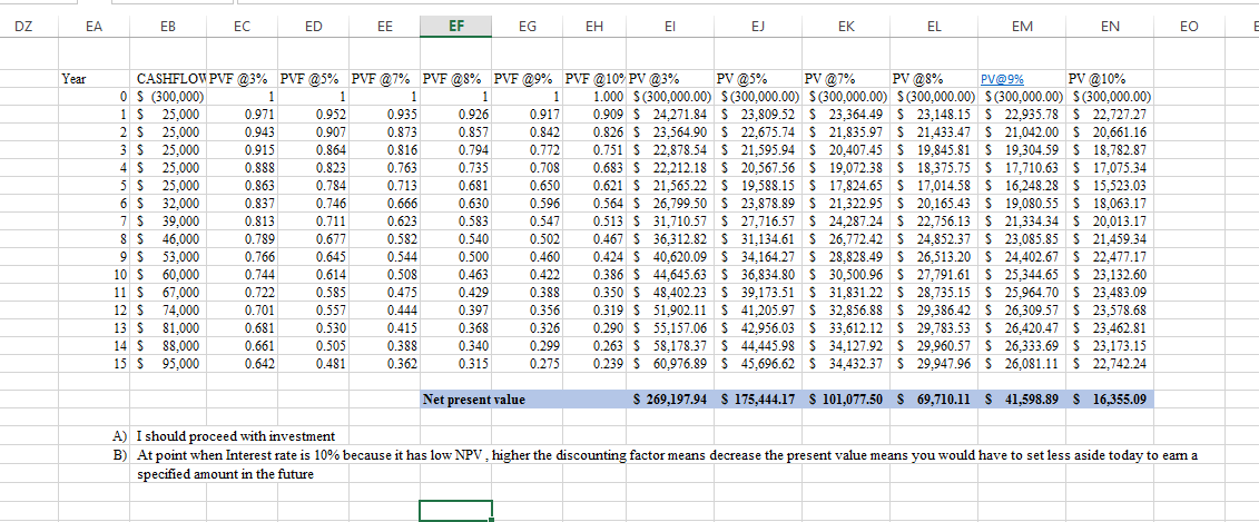 You are considering investing $300,000 in an activity which will generate a yearly income of $25,000 for the first 5 year, thereafter the income will increase by $7,000 per year for the following 10 years, when the life of the investment will end. You know that the ongoing money market interest rate is 5%.