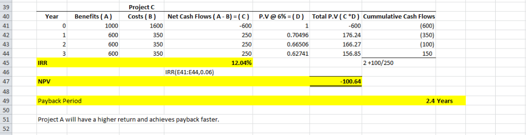 Your company is trying to decide between the following three projects. In your calculations, assume a 6% interest rate. Project A Project B Project C Project A has $400 in upfront costs in year 0 and gets 250 in benefits in year 0. It accrues $300 in benefits each year in years 1-3, and has annual costs of $200 in years 1-3. Project B costs $1300 in year 0 and has no benefits in year 0. It accrues $650 in benefits each year in years 1-3. Annual costs in years 1-3 are $450. Project C has $1000 in upfront benefits and 1600 in costs in year 0. It accrues 600 in benefits in years 1-3 and 350 in costs in years 1-3. Time value of money. Using the discounting techniques we learned in class (assume an interest rate of 6%), appropriately discount the costs and benefits of the three projects. Which project will have a higher return on investment? Be sure to show your work (10 pts). Which project achieves payback faster? (5 pts)?