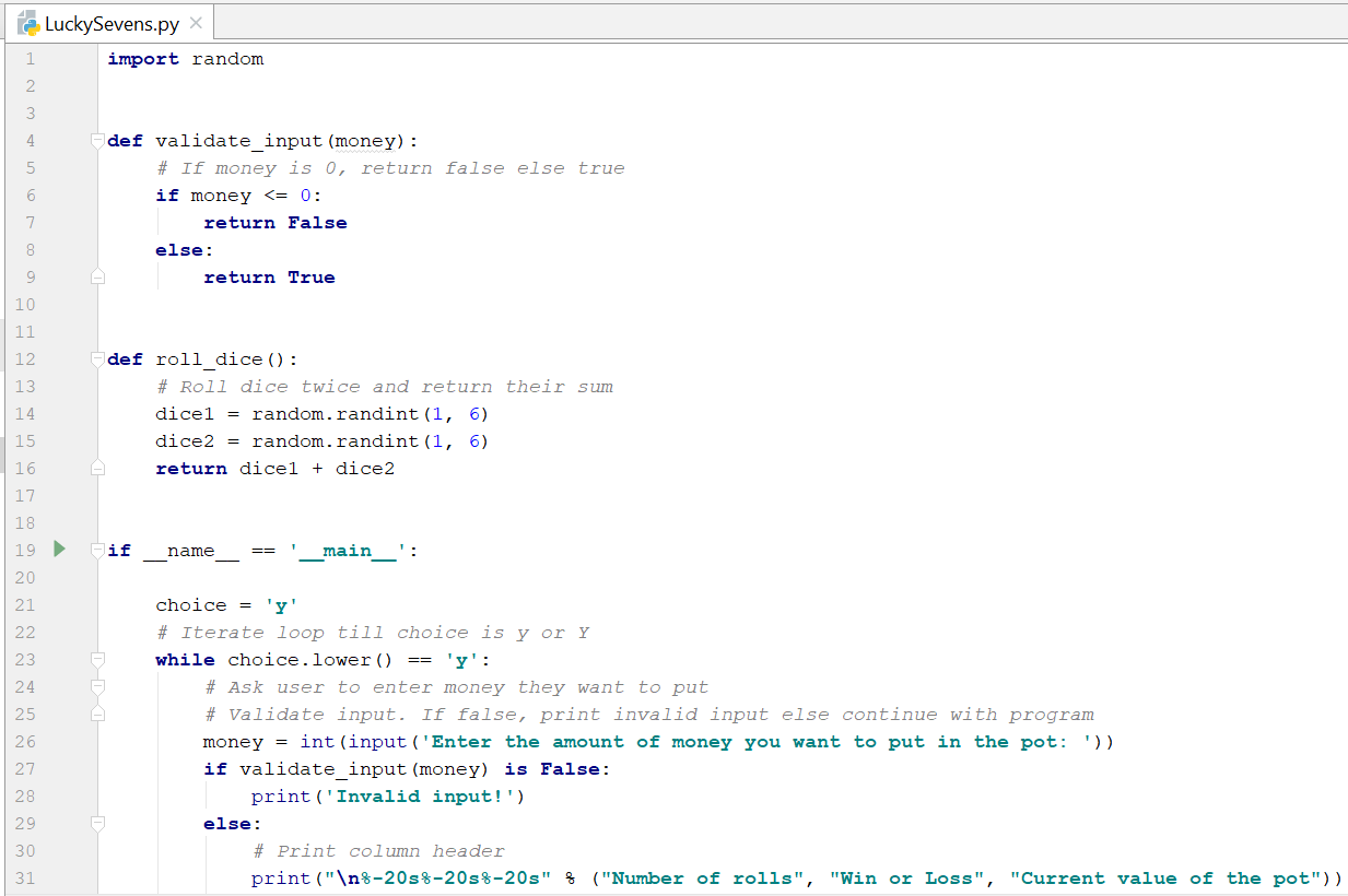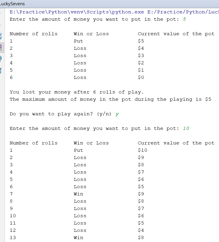 At that point the player’s pot is empty (the Current value of the pot is zero), the program should display the number of rolls it took to break the player, as well as maximum amount of money in the pot during the playing.