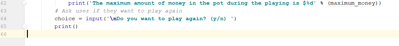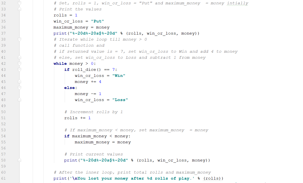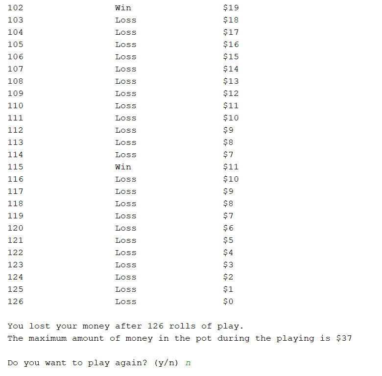 print('\nYou lost your money after %d rolls of play.' % (rolls))