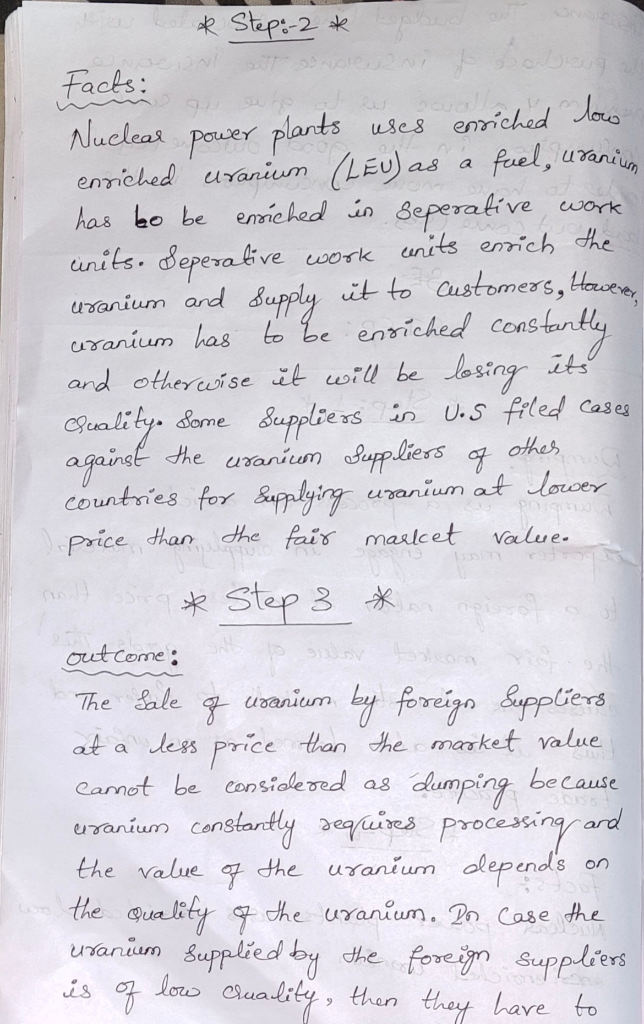Nuclear power plants use low-enriched uranium (LEU) as a fuel. LEU consists of feed uranium enriched by energy to a certain assay--the percentage of the isotope necessary for a nuclear reaction. The amount of energy required is described by an industry standard as a "separative work unit" (SWU). A nuclear utility may buy LEU from an enricher, or the utility may provide an enricher with feed uranium and pay for the SWU's necessary to produce LEU. Under an SWU contract, the LEU returned to the utility may not be exactly the uranium the utility provided. This is because feed uranium is fungible and trades like a commodity (such as wheat or corn), and profitable enrichment requires the constant processing of undifferentiated stock. Foreign enrichers, including Eurodif, S.A, allegedly exported LEU to the United States and sold it for "less than fair value." Did this constitute dumping? Explain. If so, what could be done to prevent it? [United States v. Eurodif, S.A., 555 U.S. 305, 129 S.Ct. 878, 172 L.Ed.2d 679 (2009)] (Cross & Miller, 2018, p. 228)