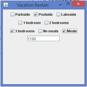 Write an application for Lambert’s Vacation Rentals. Use separate ButtonGroups to allow a client to select one of three locations, the number of bedrooms, and whether meals are included in the rental. Assume that the locations are parkside for $600 per week, poolside for $750 per week, or lakeside for $825 per week. Assume that the rentals have one, two, or three bedrooms and that each bedroom over one adds $75 to the base price. Assume that if meals are added, the price is $200 more per rental. Save the file as JVacationRental.java.