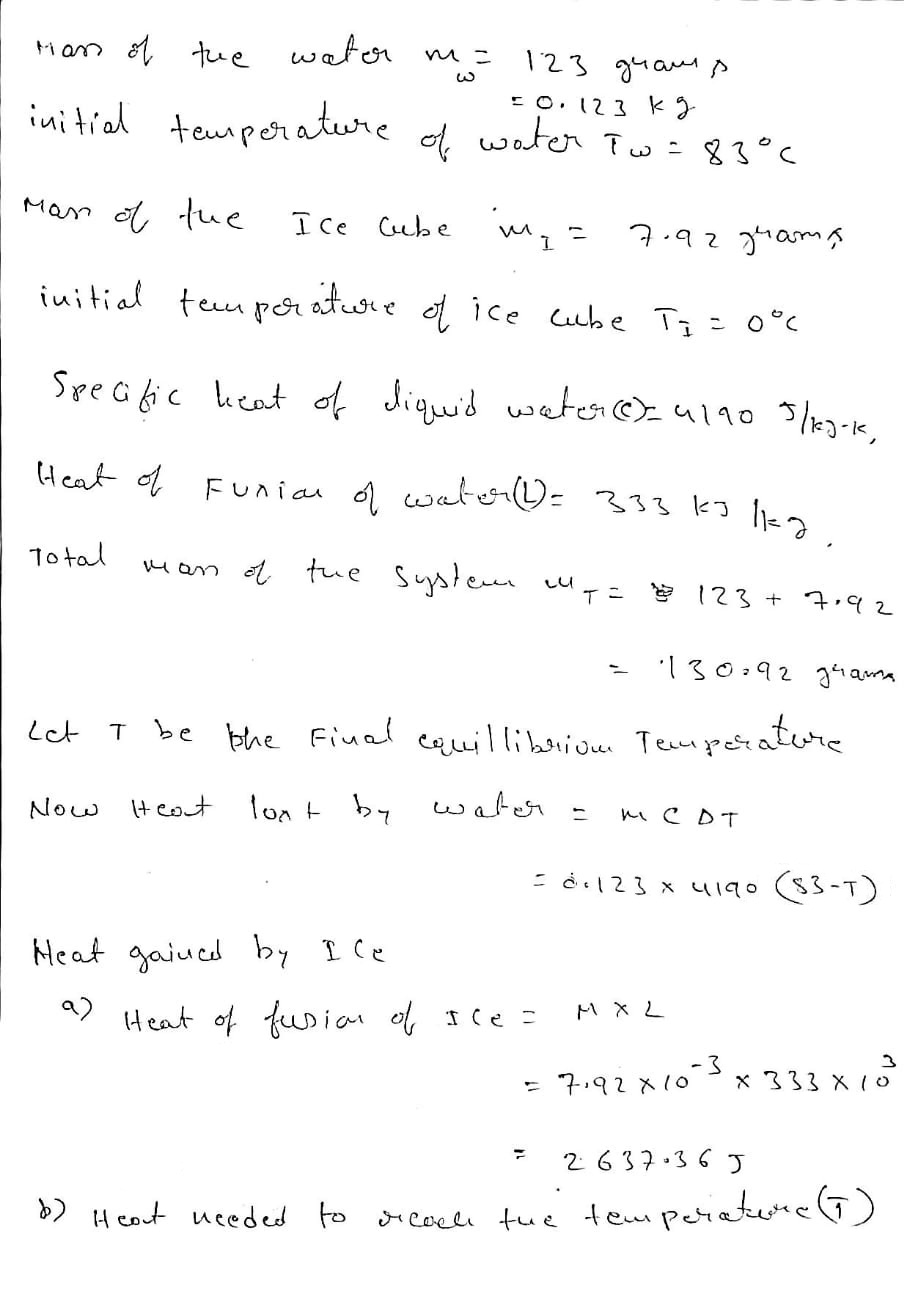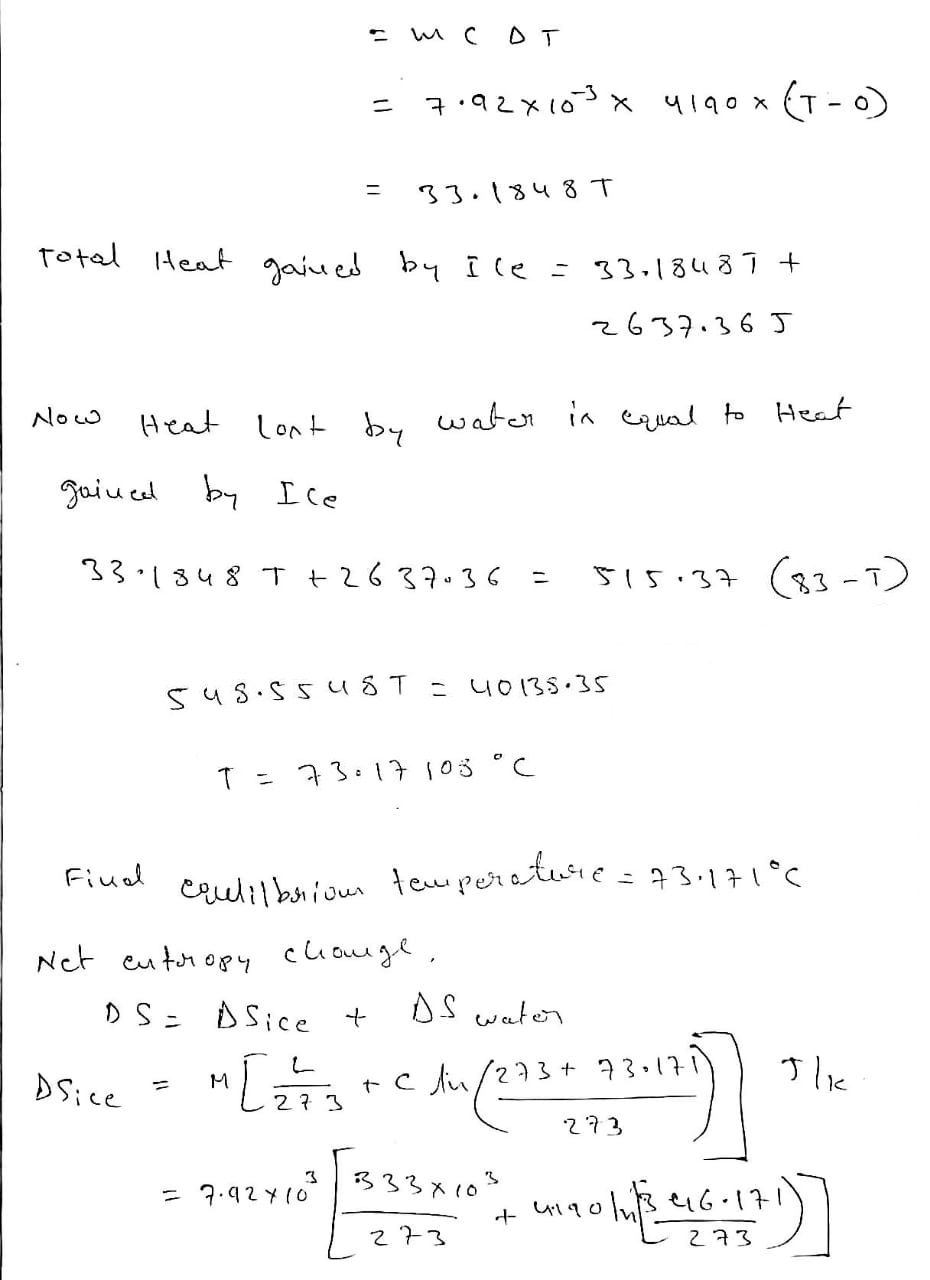 An insulated Thermos contains 123 g of water at 83.0 ˚C. You put in a 7.92 g ice cube at 0.00 ˚C to form a system of ice + original water. The specific heat of liquid water is 4190 J/kg•K; and the heat of fusion of water is 333 kJ/kg. What is the net entropy change of the system from then until the system reaches the final (equilibrium) temperature?