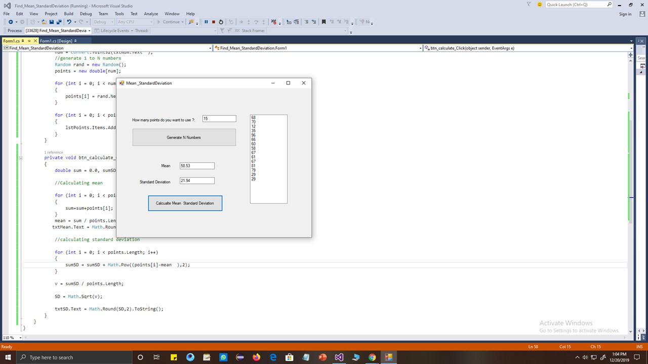 double sum = 0.0, sumSD = 0, mean, v, SD;