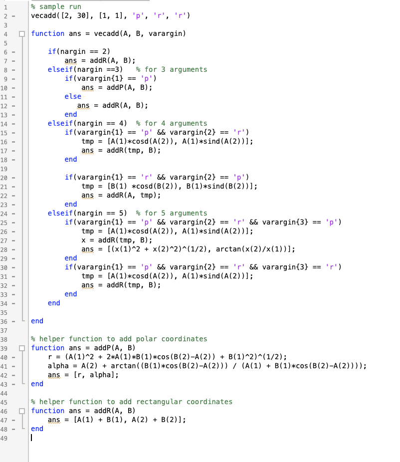 Im writing a matlab script called vecadd that deals with vectors and is converting them between polar and rectangular coordinates. It is supposed to function based upon the following parameters: