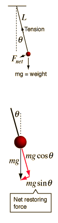 Sketch a simple pendulum displaced at a small angle. Draw and label all forces acting on the mass. Resolve the component of gravity in the direction of motion. Use Newton's 2nd law to write the dynamic equation that predicts the acceleration of the mass.