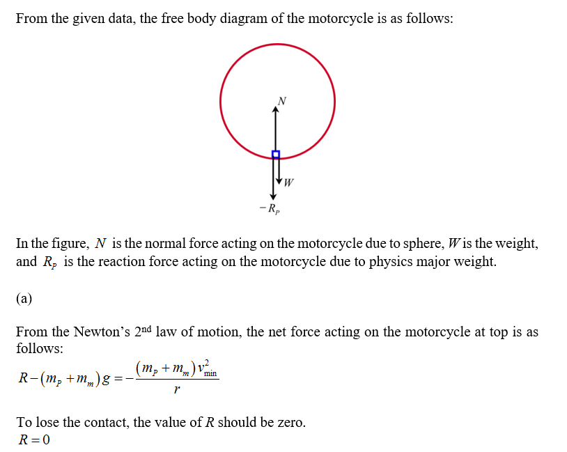A physics major is working to pay his college tuition by performing in a traveling carnival. He rides a motorcycle inside a hollow transparent plastic sphere. After gaining sufficient speed, he travels in a vertical circle with a radius of 11.0 m . The physics major has a mass of 74.0 kg , and his motorcycle has a mass of 40.0 kg