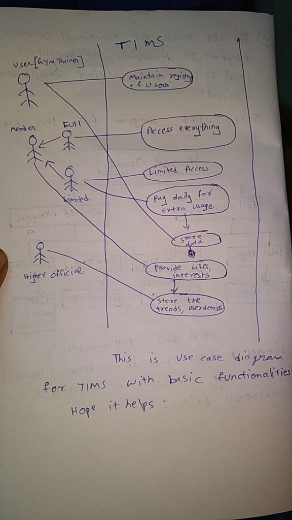 The below is a use case diagram for tims .it consists of users like gym trainer,member(full and limited) and also higher official. This is samole use case diagram