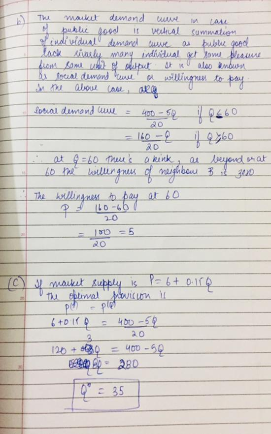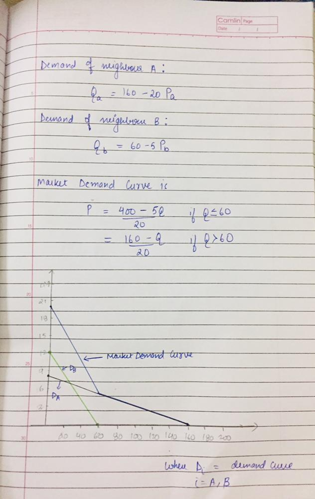 Assume two neighbors who live next to a pond. Both neighbors get together to determine how each of them value a large deck overseeing the pond. After some economic analysis, they arrive at the following demand estimates: Qa = 160 − 20Pa , Qb = 60 − 5Pb where Q is the size of the deck to be built and P is the price of inputs and labor.