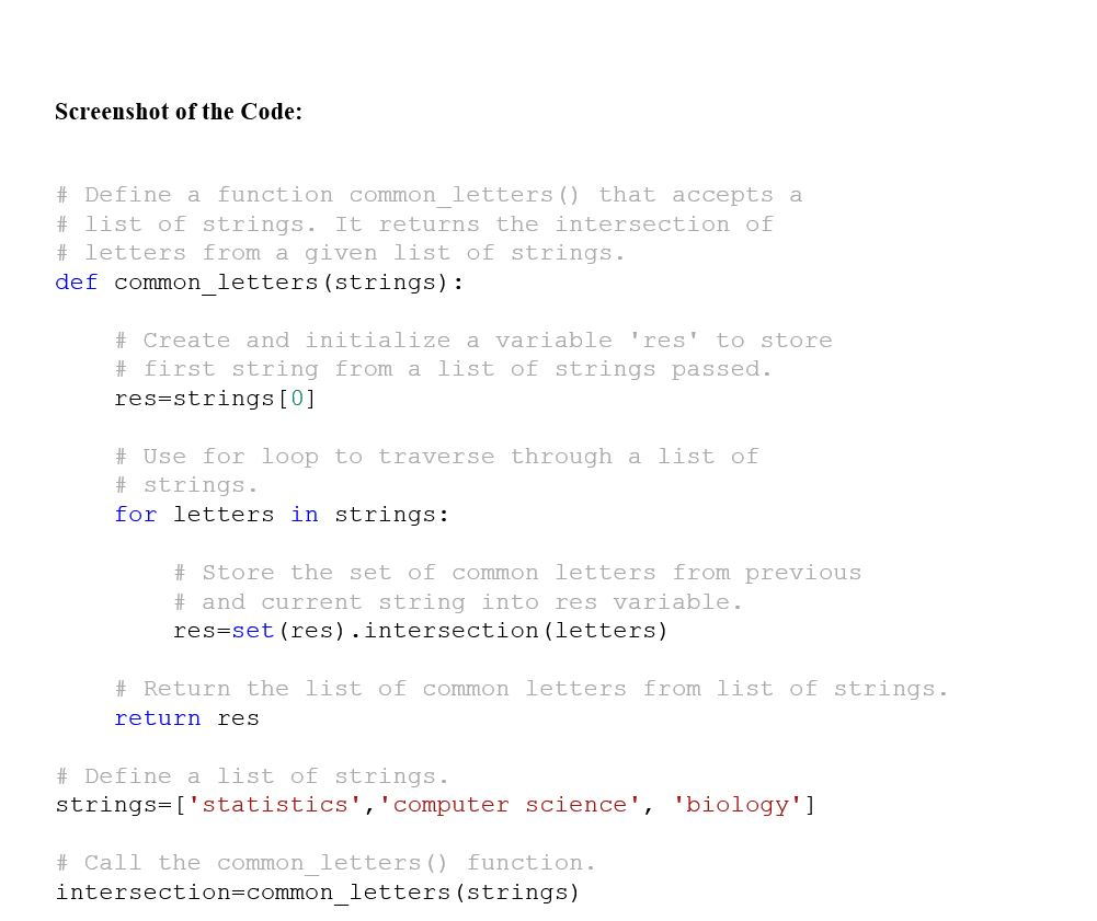 1. Create a function named common_letters(strings) that returns the intersection of letters among a list of strings. The parameter is a list of strings.
