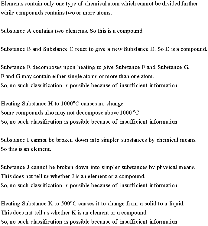 Analysis with an elaborate instrument indicates that •Substance A contains two elements. •Substance B and Substance C react to give a new Substance D. •Substance E decomposes upon heating to give Substance F and Substance G. •heating Substance H to 1000°C causes no change. •Substance I cannot be broken down into simpler substances by chemical means. •Substance J cannot be broken down into simpler substances by physical means. •heating Substance K to 500°C causes it to change from a solid to a liquid.