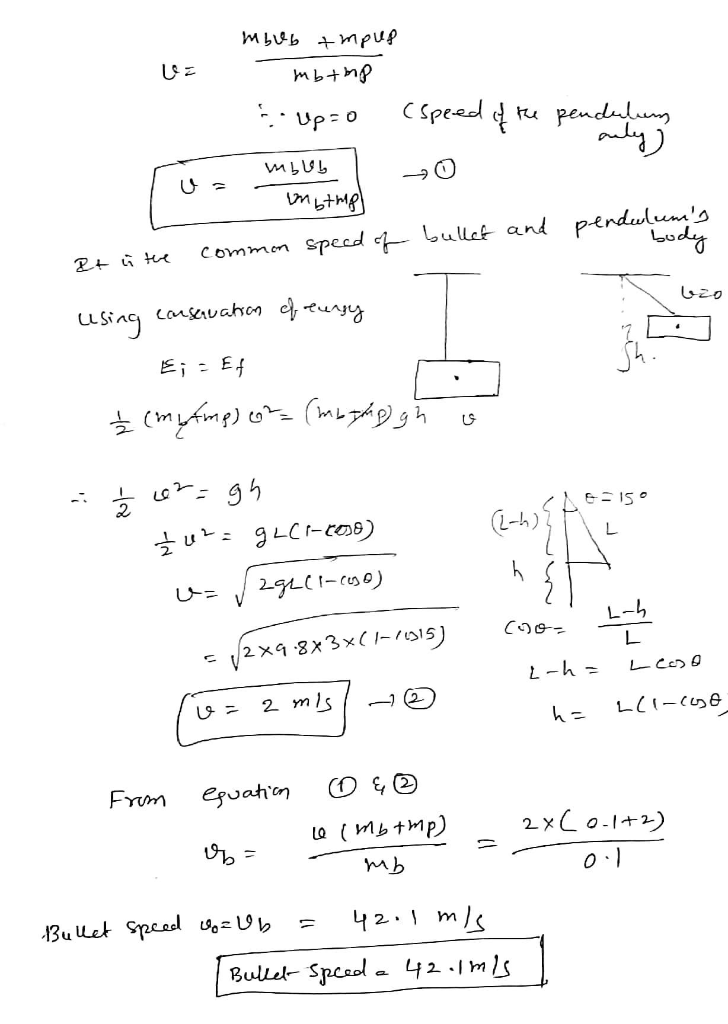 A bullet with mass m = 0.1 kg grams hits a ballistic pendulum with length L = 3 meters and mass M = 2 kg and lodges in it. When the bullet hits the pendulum it swings up from the equilibrium position and reaches an angle 15 degrees at its maximum. In this problem, you will determine the bullet’s velocity. First, I want to ask you a couple of questions: