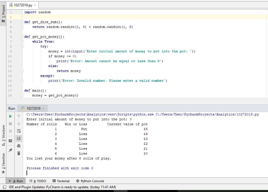 At that point the player’s pot is empty (the Current value of the pot is zero), the program should display the number of rolls it took to break the player, as well as maximum amount of money in the pot during the playing.