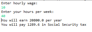 Social Security Payout. If you’re taking this course, chances are that you’re going to make a pretty good salary – especially 3 to 5 years after you graduate. When you look at your paycheck, one of the taxes you pay is called Social Security. In simplest terms, it’s a way to pay into a system and receive money back when you retire (and the longer you work and the higher your salary, the higher your monthly benefit). Interestingly, your employer will pay the same amount for you. The current tax rate is 6.2% until you make approximately $132,900. For this assignment, we’re going to help out hourly employees. Design (pseudocode) and implement (source code) a program that asks users how much they make per hour, the number of hours they work per week, and calculates the yearly income. For the second half, the program should calculate and display the amount of Social Security tax the user will pay for that year. You must write and use at least two functions in addition to the main function. At least one function must not have a void return type. Note, don’t forget to put the keywords “public” and “static” in front of your functions. Document your code and properly label the input prompt and the outputs as shown below.