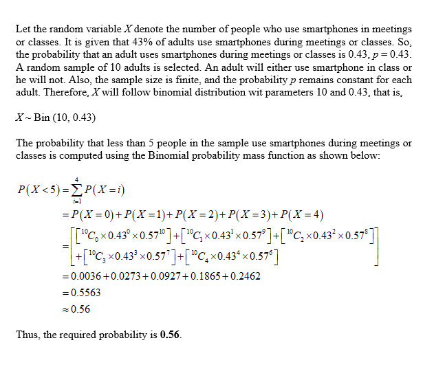 Assume that when adults with smartphones are randomly selected, 43% use them in meetings or classes. If 10 adult smartphone users are randomly selected, find the probability that fewer than 5 of them use their smartphones in meetings or classes.