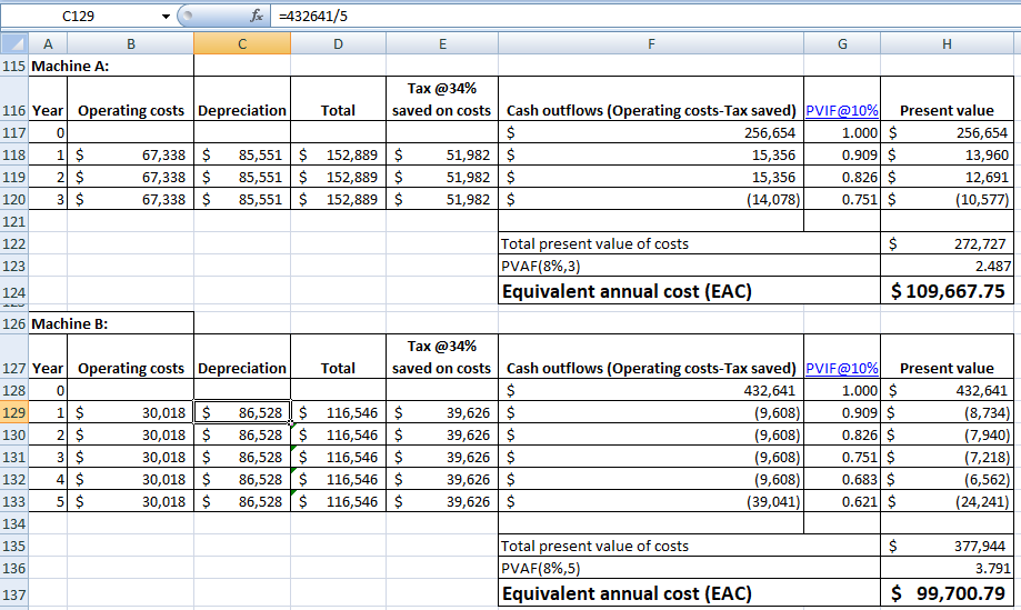 You are evaluating two different milling machines to replace your current aging machine. Machine A costs $256654, has a three-year life, and has pretax operating costs of $67338 per year. Machine B costs $432641, has a five-year life, and has pretax operating costs of $30018 per year. For both milling machines, use straight-line depreciation to zero over the project’s life and assume a salvage value of $44596. Your tax rate is 34 % and your discount rate is 10 %. What is the EAC for Machine A? (Round answer to 2 decimal places. Do not round intermediate calculations)