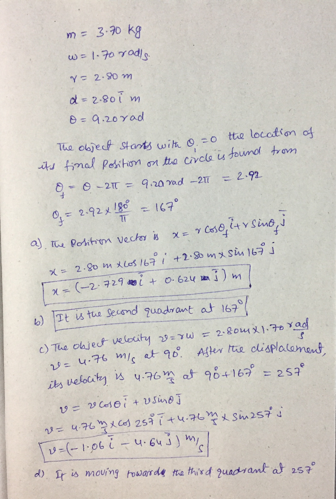 A small object with mass 3.70 kg moves counterclockwise with constant speed 1.70 rad/s in a circle of radius 2.80 m centered at the origin. It starts at the point with position vector 2.80î m. Then it undergoes an angular displacement of 9.20 rad. (a) What is its new position vector? m (b) In what quadrant is the particle located and what angle does its position vector make with the positive x-axis? at ° (c) What is its velocity? m/s (d) In what direction is it moving? ° from the +x direction. (e) What is its acceleration? m/s2 (f) Make a sketch of its position, velocity, and acceleration vectors. This answer has not been graded yet. (g) What total force is exerted on the object? N