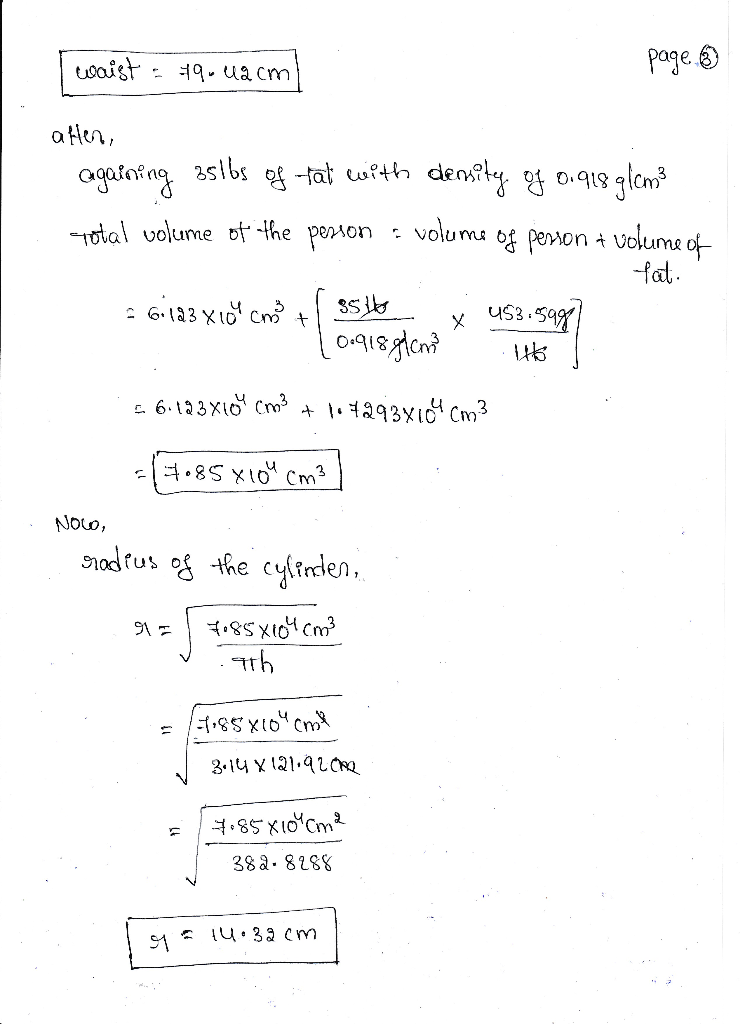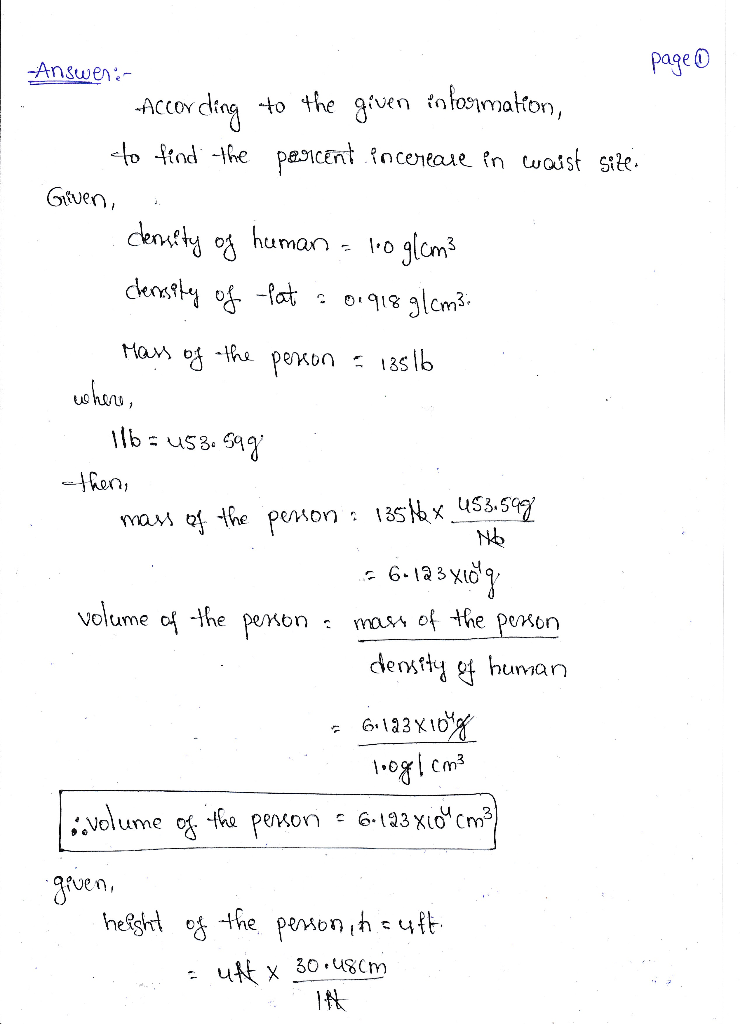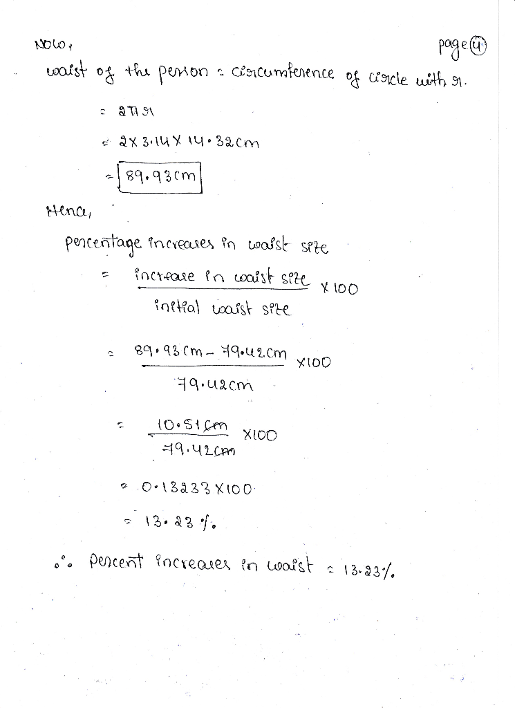 Approximate the percent increase in waist size that occurs when a 135 lb person gains 35.0 lbs of fat. Assume that the volume of the person can be modeled by a cylinder that is 4.0 feet tall. The average density of a human is about 1.0 g/cm^3 and the density of fat is 0.918 g/cm^3