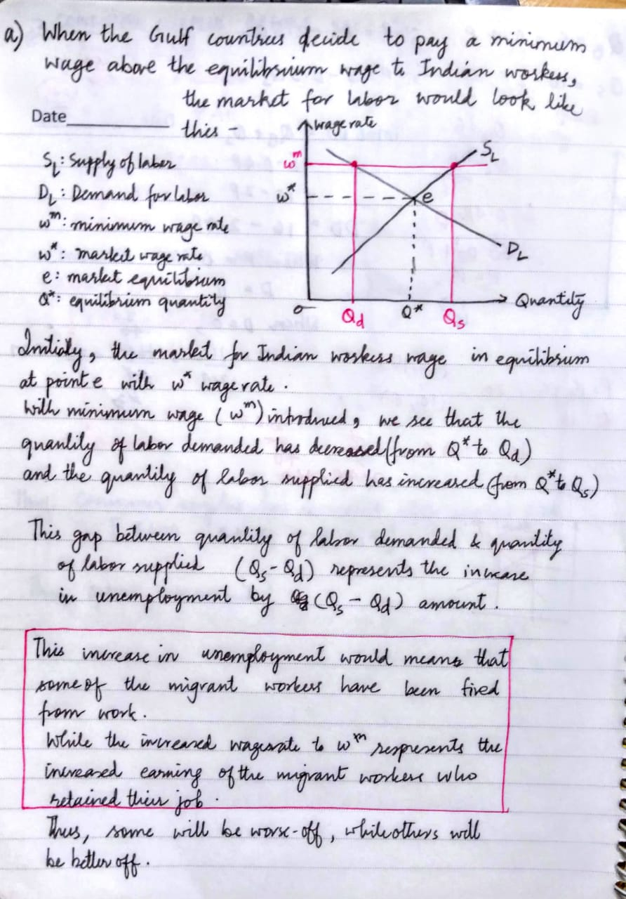 b) How would the market for labor be affected in India? Draw a supply and demand graph to illustrate your answer. Be careful: the minimum wage is in the Gulf countries, not in India.
