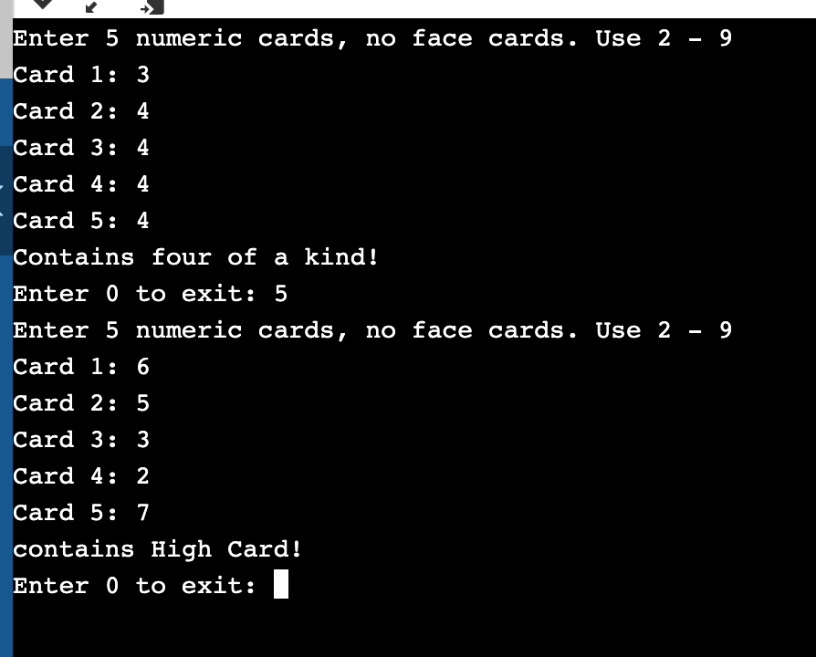 2) Of course, as a matter of good practice, you should use a constant to represent the number of cards in the hand, and everything in your code should still work if the number of cards in the hand is changed to 4 or 6 or 11 (for example). Writing your code so that it does not easily generalize to more than 5 cards allows you to avoid the objectives of this assignment (such as traversing an array using a loop). If you do this, you will receive a 0 on the assignment.