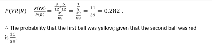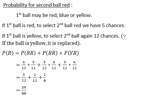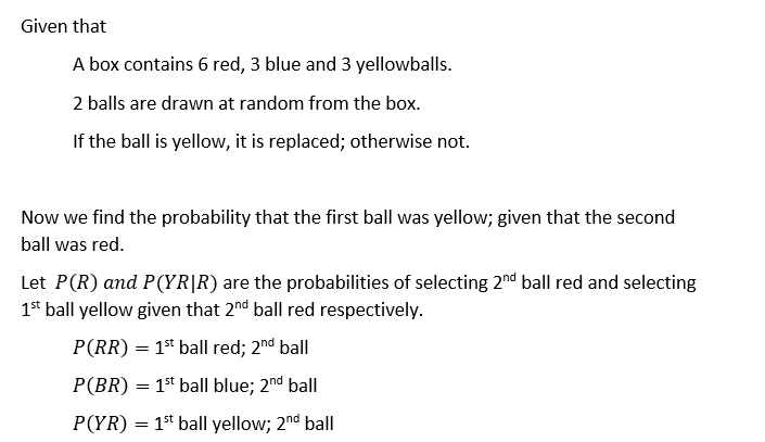 Rework problem 28 from section 3.4 of your text, involving the drawing of two balls from a box of colored balls. Assume the box contains 12 balls: 6 red, 3 blue, and 3 yellow. A ball is drawn and its color noted. If the ball is yellow, it is replaced; otherwise, it is not. A second ball is then drawn and its color is noted.