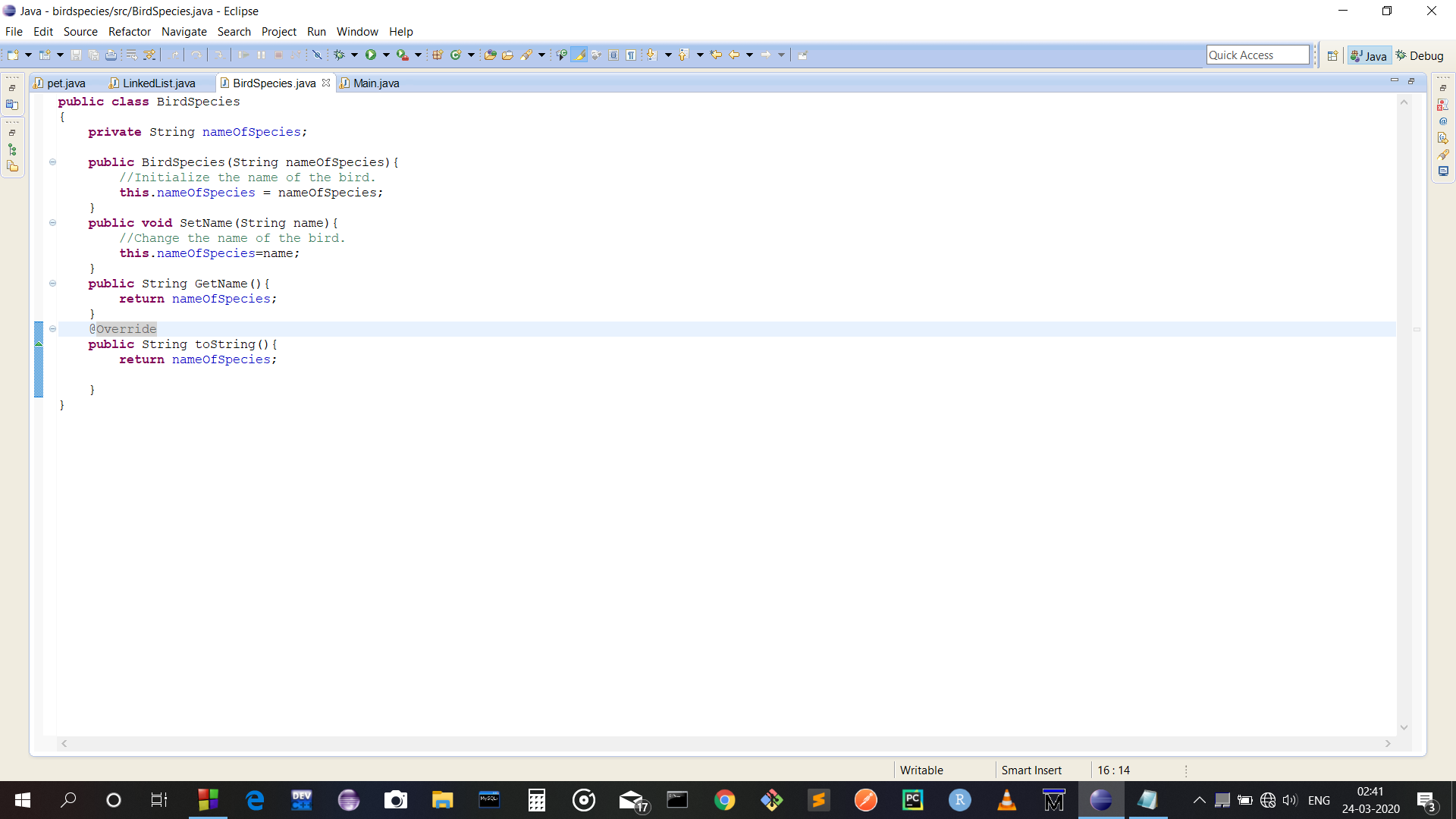 Create a BirdSpecies class that has private variables for the name of the species. Use an overloaded constructor to create a BridSpecies with a given name. Also use a getter and setter that manipulate the name. Finally, let’s make a ToString method that returns the name of the species.