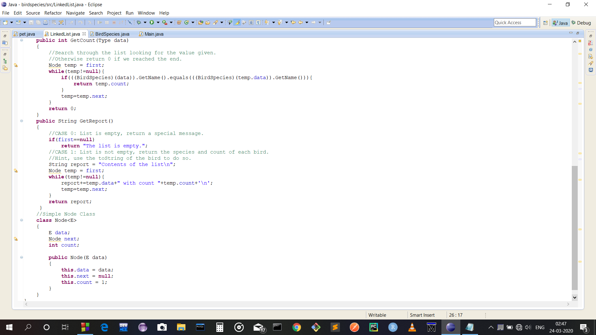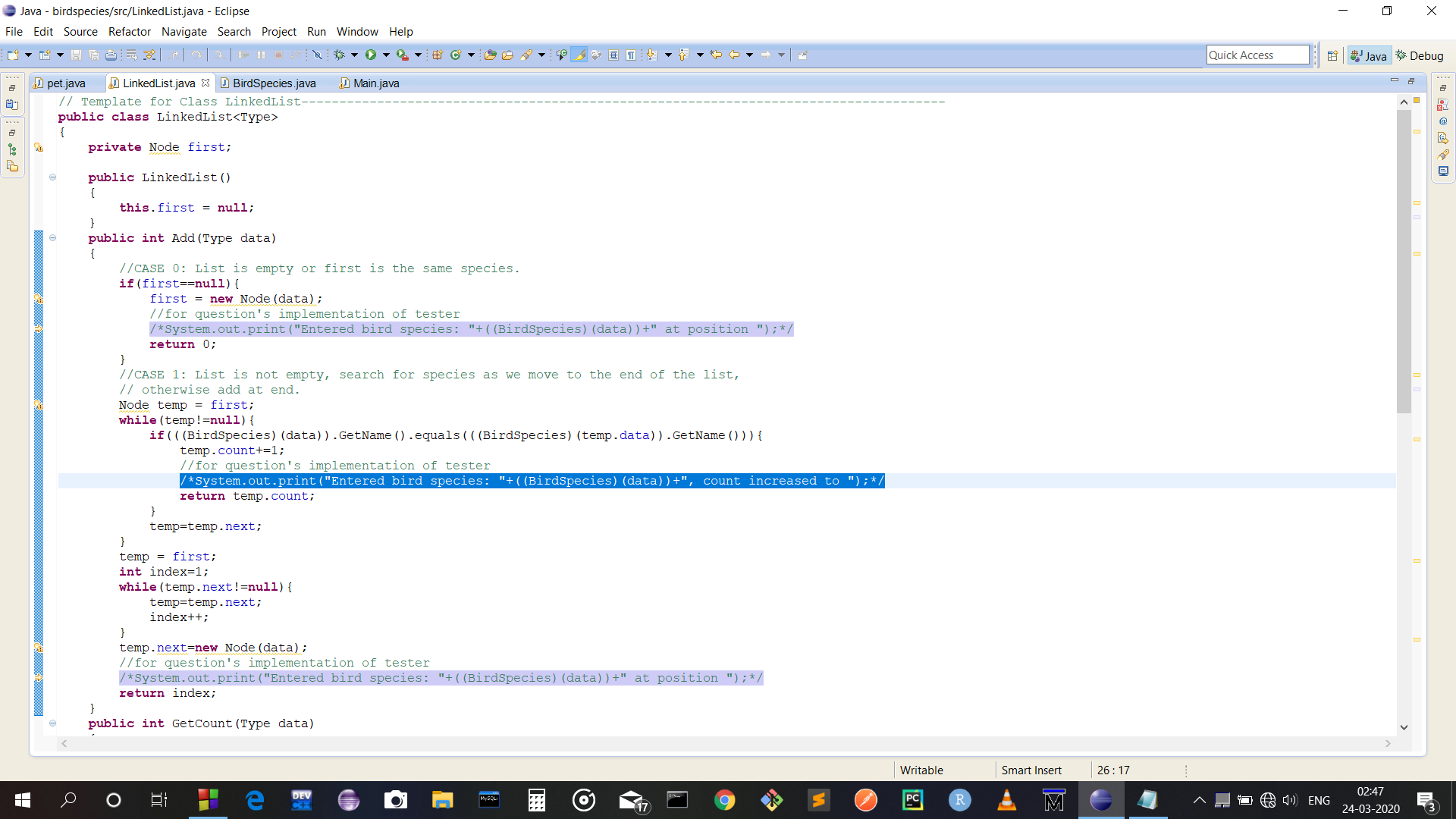 Next is to create an Add method. This will add the given BirdSpecies object to the end of the list, if the species is not already in the list. If it is in the list, then the variable count of that species is increased by one (remember that count comes from the node, not the list or BirdSpecies class). Also keep track of the position where a new BirdSpecies was added into the list. This will be returned to the Main method.