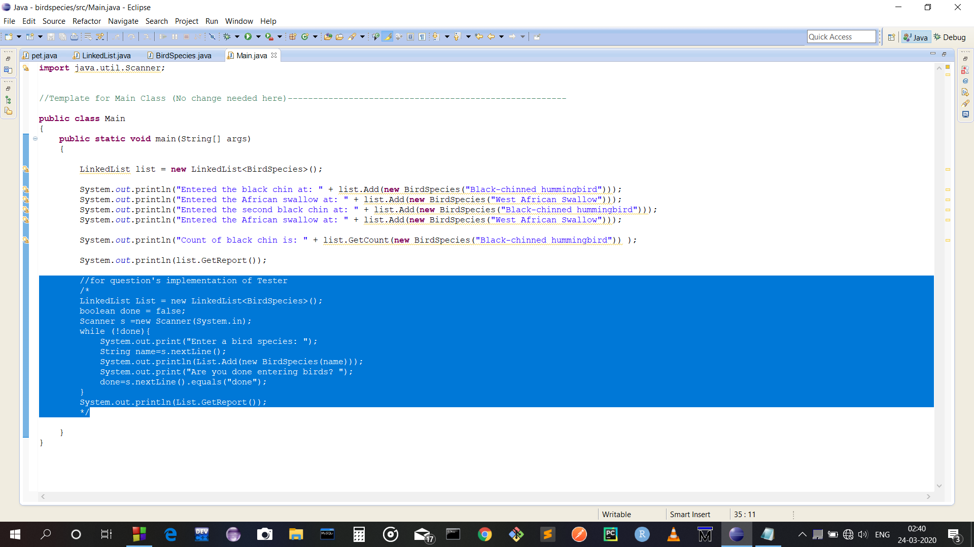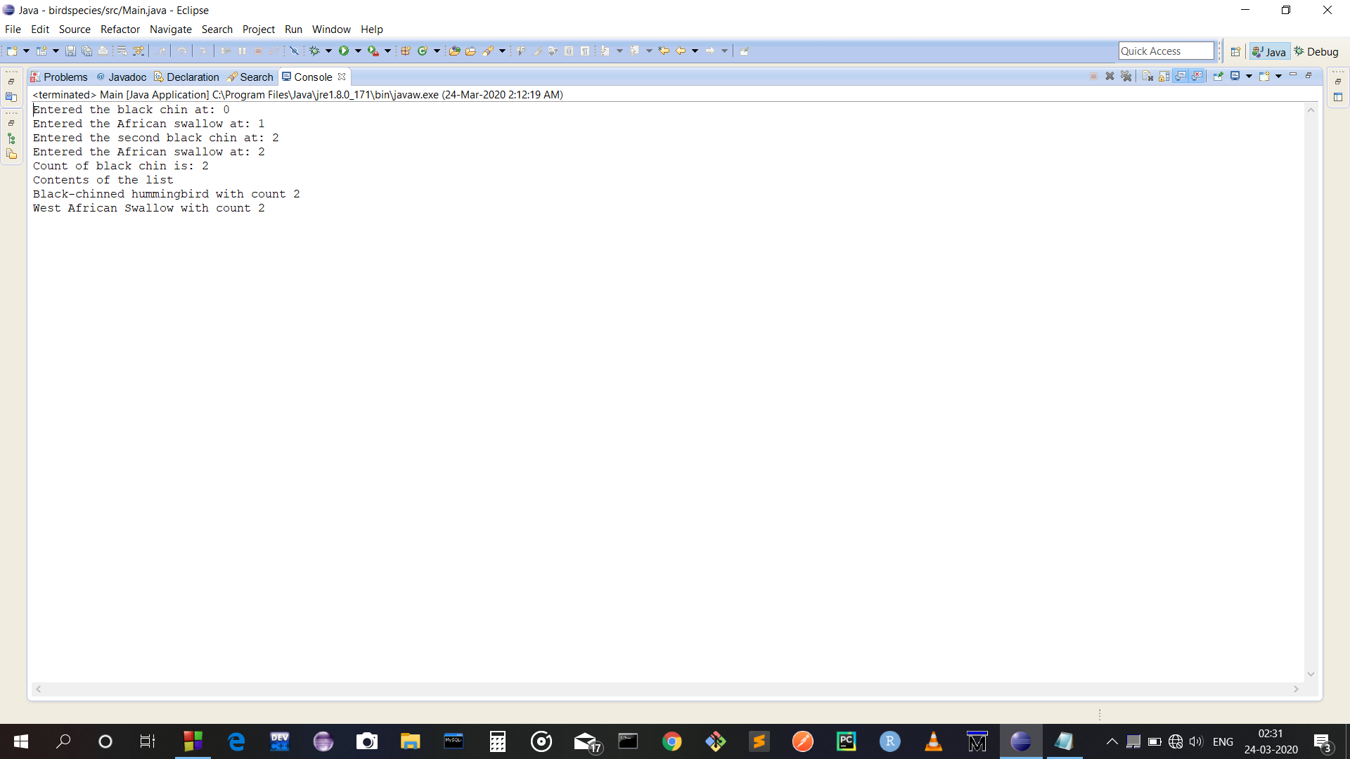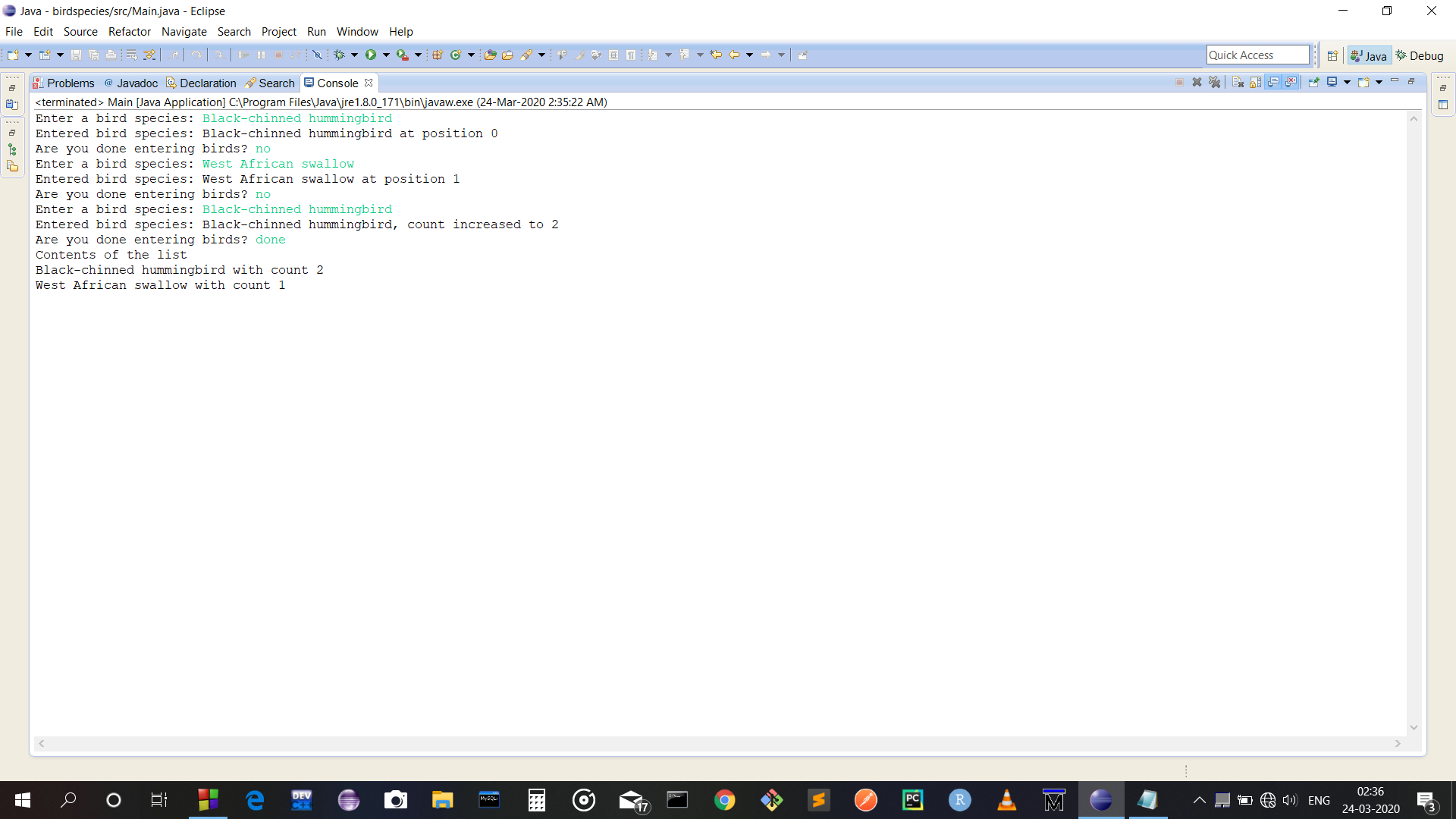 System.out.println("Entered the second black chin at: " + list.Add(new BirdSpecies("Black-chinned hummingbird")));