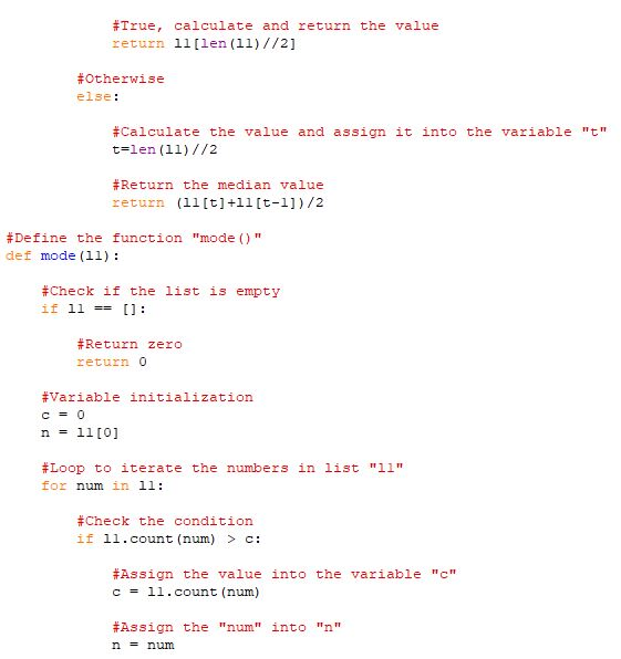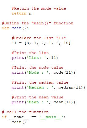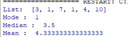 A group of statisticians at a local college has asked you to create a set of functions that compute the median and mode of a set of numbers. Define these functions, median and mode, in a module named stats.py. Also include a function named mean, which computes the average of a set of numbers. Each function should expect a list of numbers as an argument and return a single number. Each function should return 0 if the list is empty. Include a main function that tests the three statistical functions using the following list defined in main: userList = [3, 1, 7, 1, 4, 10] An example of the program output is shown below: List: [3, 1, 7, 1, 4, 10] Mode: 1 Median: 3.5 Mean: 4.33