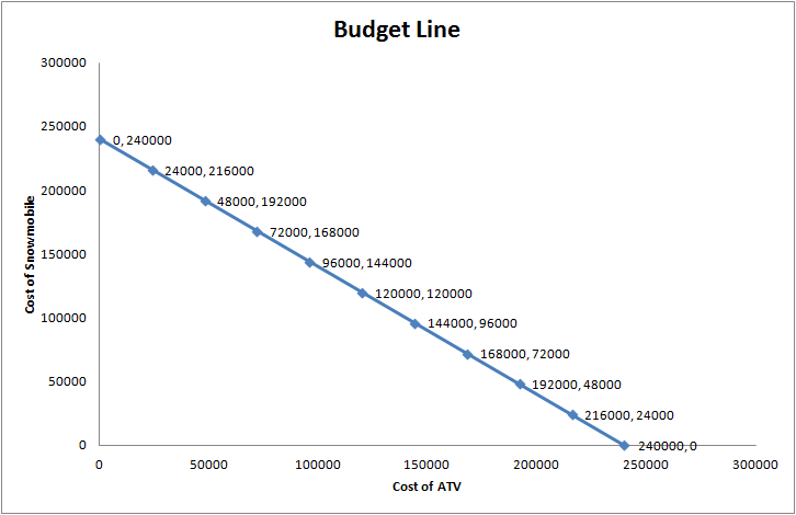 Suppose you own an outdoor recreation company and you want to purchase all-terrain vehicles (ATVs) for your summer business and snowmobiles for your winter business. Your budget for new vehicles this year is $240,000. ATVs cost $8000 each and snowmobiles cost $12,000 each.