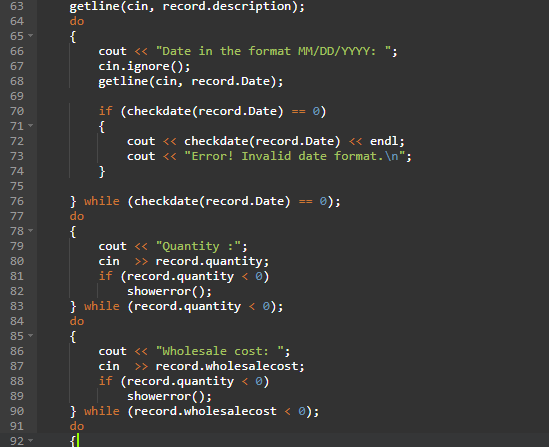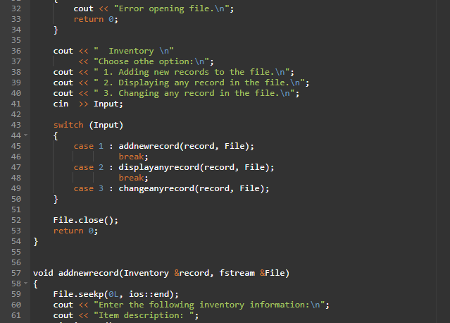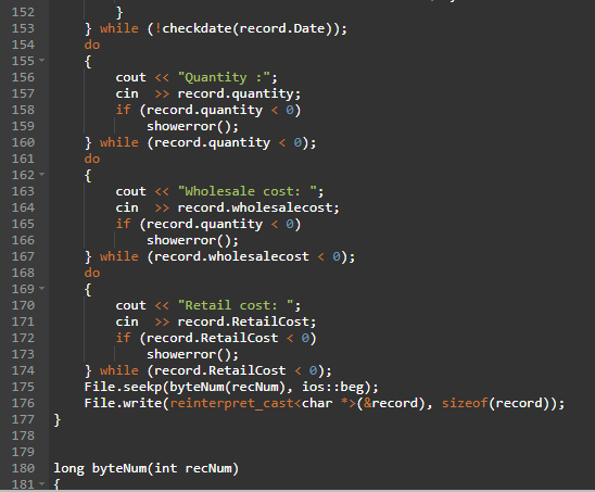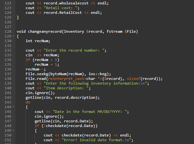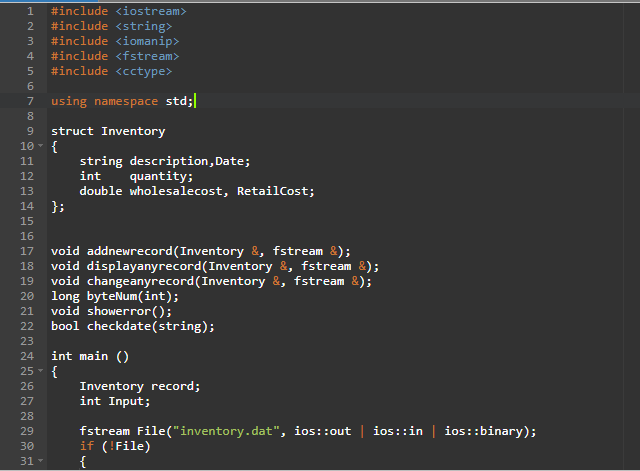 Write a program that uses a structure to store the following inventory information in a Binary file and access it using Random Access Method: Item description Quantity on hand Wholesale cost Retail cost Date added to inventory The program should have a menu that allows the user to perform the following tasks: Add new records to the file Display any record in the file Change any record in the file For exact menu option text please see the test cases below